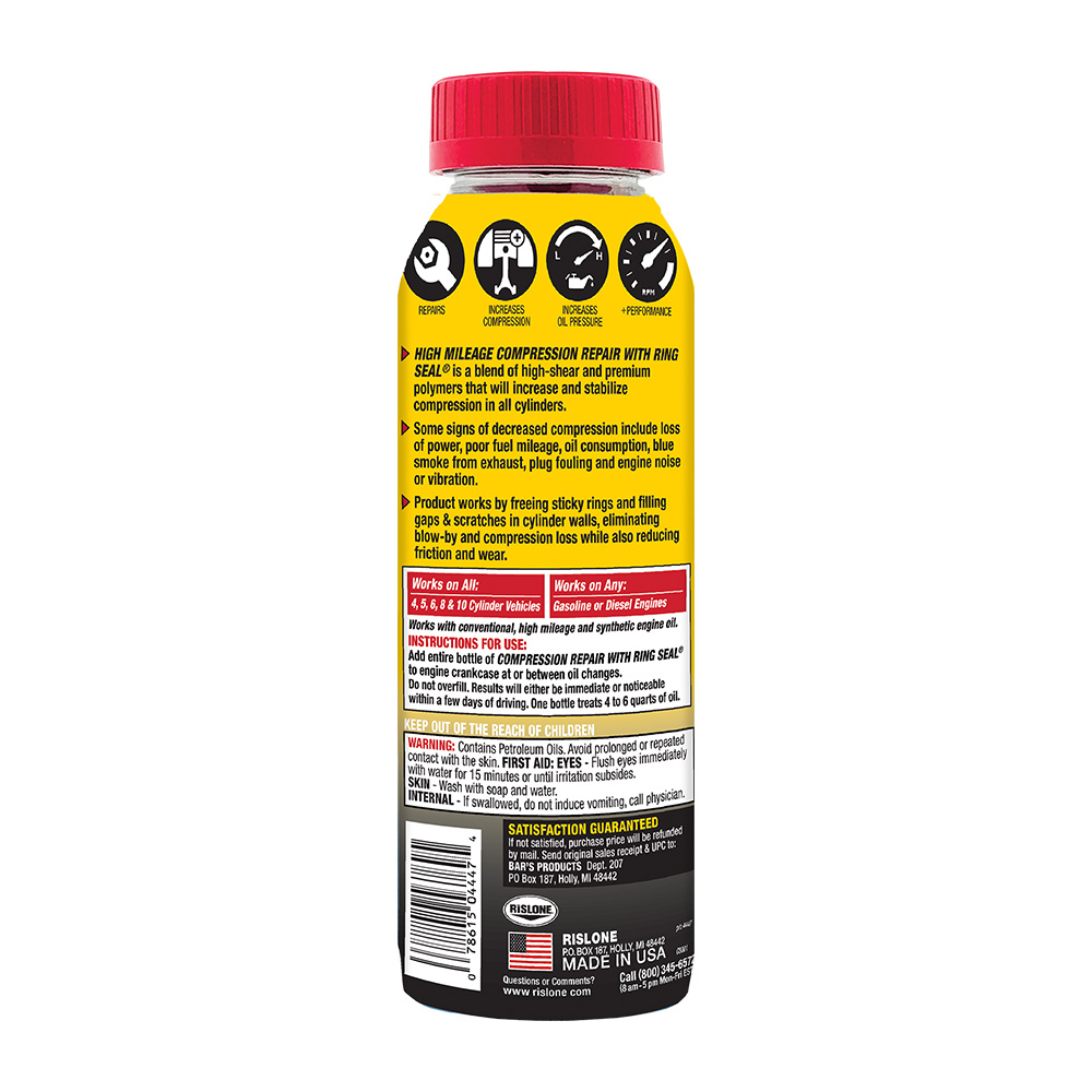 - Rislone Compression Repair met Ring Seal is een geconcentreerde en een gepatenteerde mix van petroleumadditieven die is ontwikkeld voor motoren met een hogere kilometerstand die last hebben van verminderde of ongelijkmatige compressie. Het bevat een uniek motoradditief dat versleten delen in de cilinderwand repareert, waardoor de cilindercompressie wordt hersteld en de motorprestaties tot in bijna nieuwe originele staat worden verbeterd.